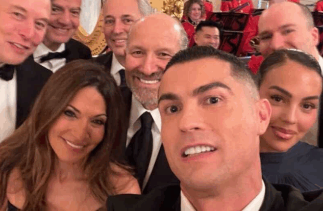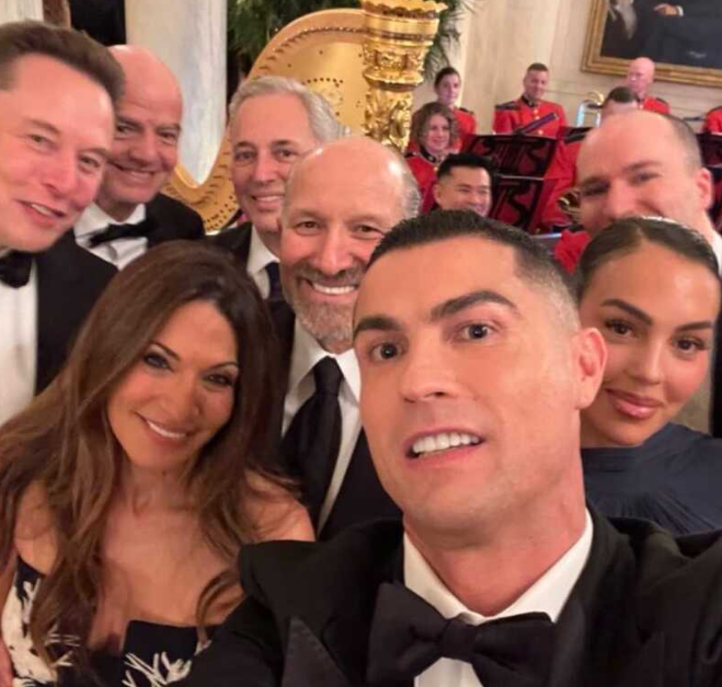 التقط نجم كرة القدم البرتغالي كريستيانو رونالدو صورة سيلفي خلال مأدبة عشاء رسمية أقامها الرئيس الأمريكي السابق دونالد ترامب تكريما لولي العهد السعودي الأمير محمد بن سلمان.